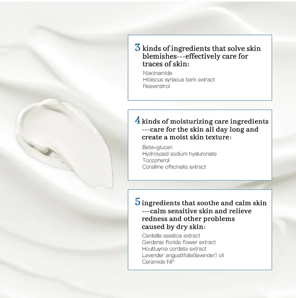 Contains 3 types of ingredients targeting blemishes, 4 types for moisturizing, and 5 types for soothing and calming the skin.